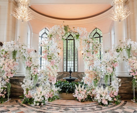 The ceremony happens outdoors in the gardens, on the terrace or indoors in the Great Hall with a 60 ft ceiling. Other rooms can also be set for your nuptials. Lavish fountains with unique sculptures and rare flowers are gorgeous backdrops for photos and ceremonies for 250 ceremony guests.