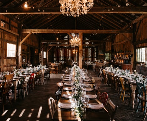 The Century Barn provides a warm elegant setting for your reception, harvest tables with mismatched antique wooden chairs, vintage tableware and grand chandeliers