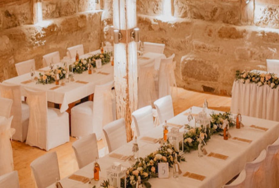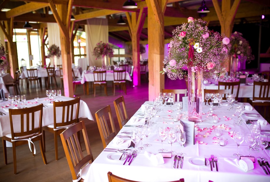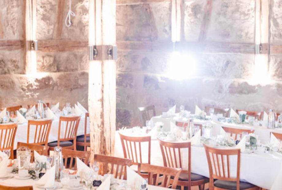 Die Holzbalken und hohen Decken in einer Scheune sorgen für eine rustikale, aber gemütliche Atmosphäre bei jeder Hochzeit! Mit weißen Tischdecken, Hussen auf den Stühlen und der richtigen Beleuchtung wird aus einer einfachen Location der Ort für eine Traumhochzeit. Mehr erfahren