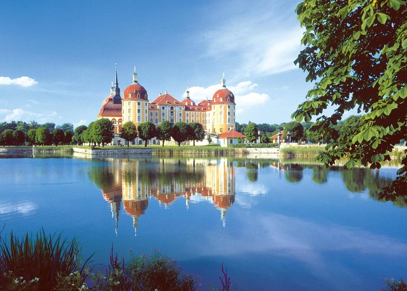 Schloss Moritzburg Schloss Moritzburg ist ein Barockschloss aus dem 18. Jahrhundert, das in der Nähe von Dresden liegt. Es ist von einem wunderschönen See und Park umgeben und besonders beliebt, seit es im tschechischen Märchenfilm "Drei Haselnüsse für Aschenbrödel" als Kulisse zu sehen war.