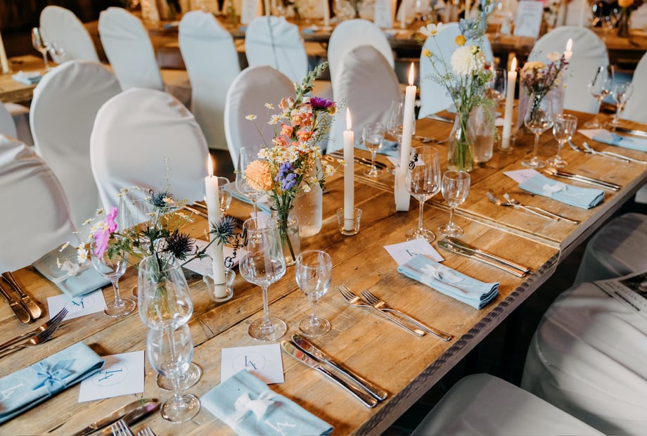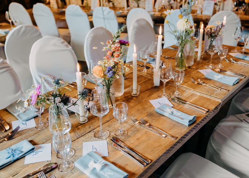 Auf die Tische passen gro�e, �ppige Blumenarrangements in Gl�sern oder Vintage-Vasen. Kerzen und Laternen sorgen f�r sanftes, stimmungsvolles Licht. Auch DIY-Elemente wie handgeschriebene Platzkarten oder Schilder k�nnen die Dekoration wunderbar abrunden. Sie verleihen eurer Hochzeit in einer Scheune in Deutschland einen pers�nlichen Touch.