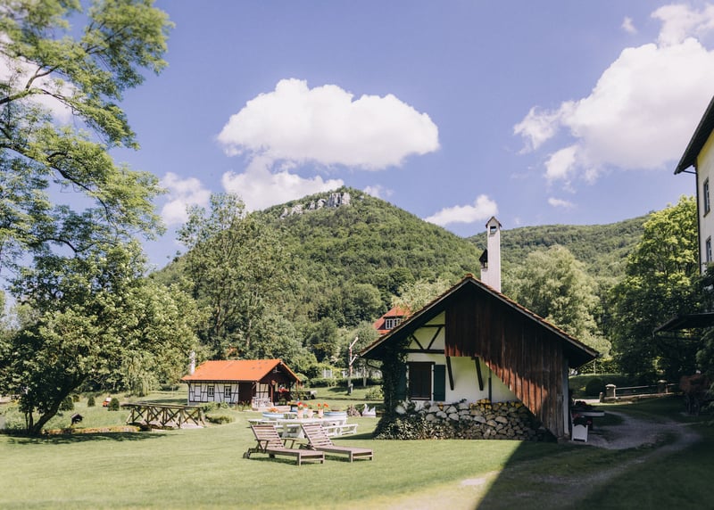 Hofgut Albfähren (Baden-Württemberg): Wenn ihr es richtig grün mögt, ist diese Scheune optimal – sie liegt inmitten von Wiesen und Wäldern und ist perfekt für eine Hochzeit in einer Scheune im Boho-Stil.