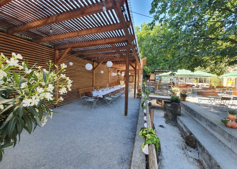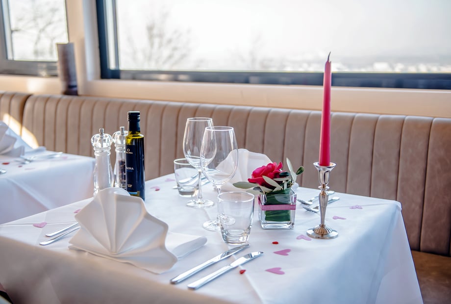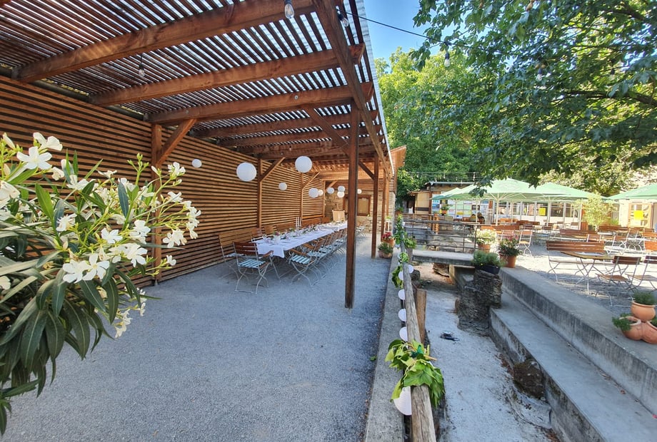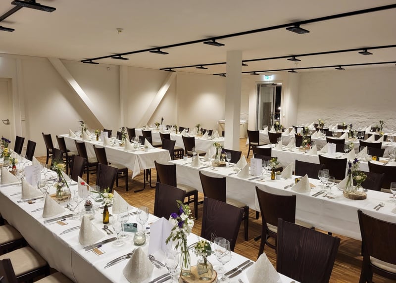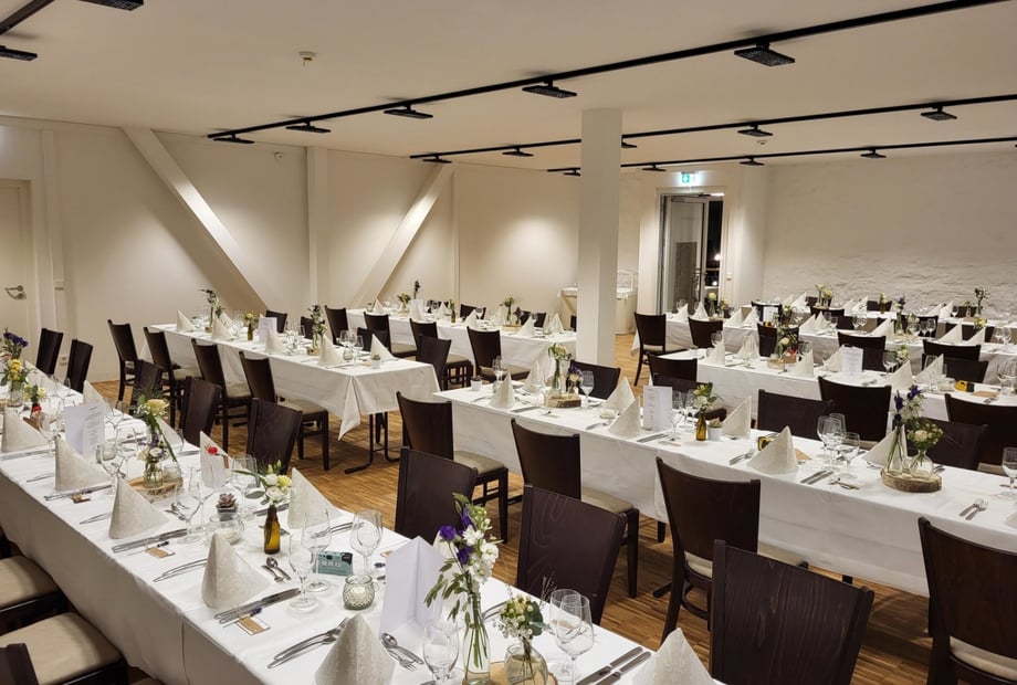 Das Restaurant Zum Auerhahn begeistert mit einem großzügigen Gastraum im charmanten Scheunenstil und einer einladenden, geräumigen Terrasse.