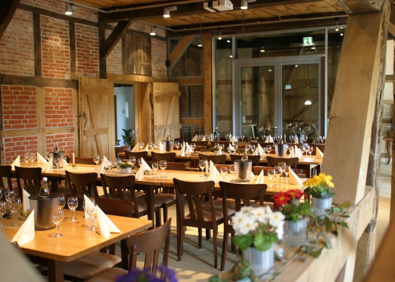 Kuhstall in der Nähe von Hamburg: Der umgebaute Kuhstall verfügt über ein geräumiges Interieur und bietet in gemütlicher Atmosphäre Platz für bis zu 120 Gäste. Auch hier gibt es einen schönen Garten für Zeremonien und Empfänge im Freien.