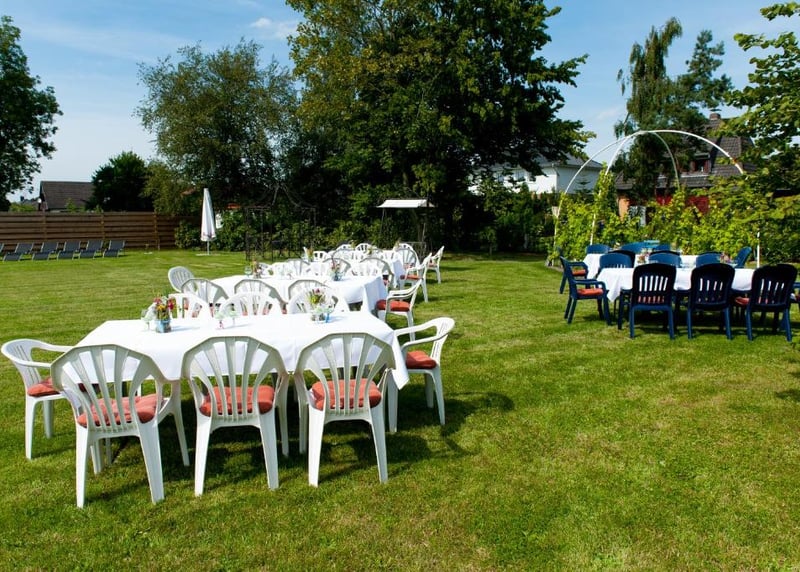 Kuhstall in der Nähe von Hamburg: Der umgebaute Kuhstall verfügt über ein geräumiges Interieur und bietet in gemütlicher Atmosphäre Platz für bis zu 120 Gäste. Auch hier gibt es einen schönen Garten für Zeremonien und Empfänge im Freien.