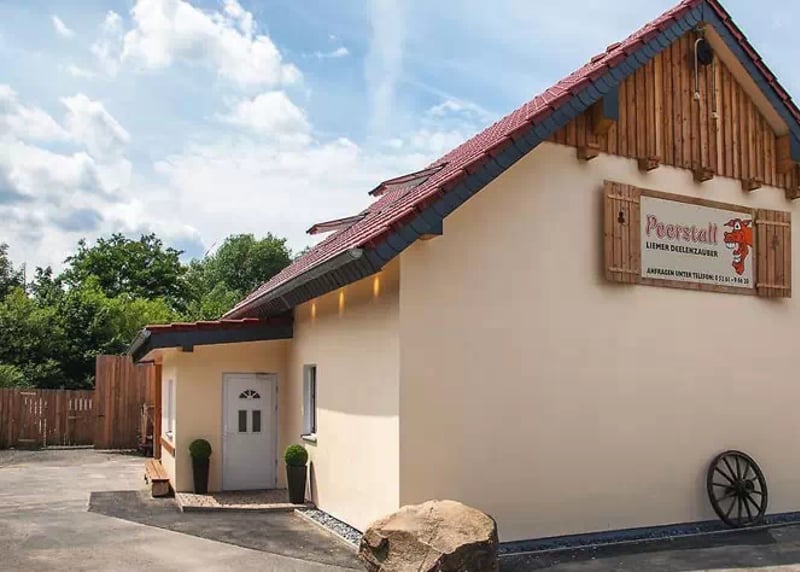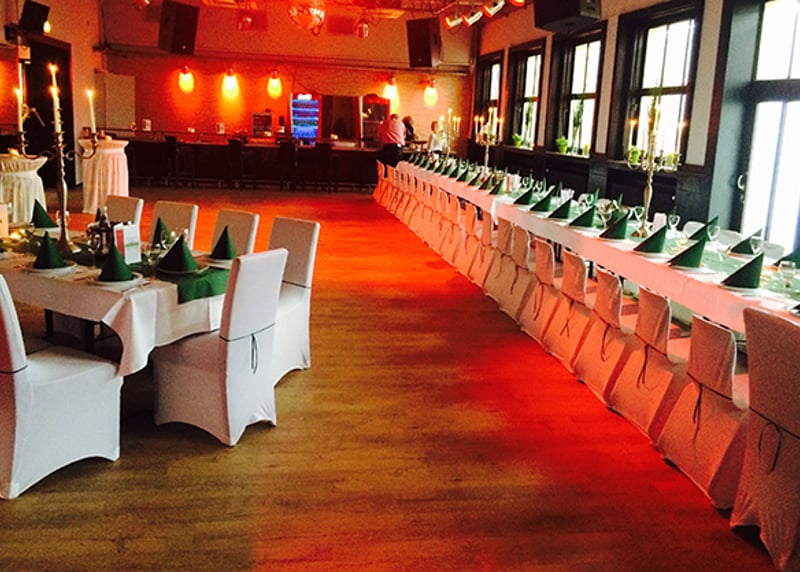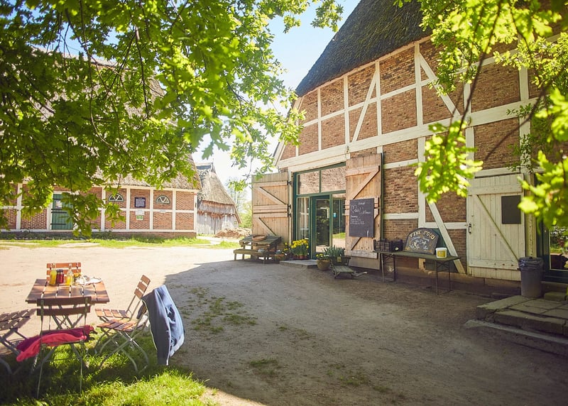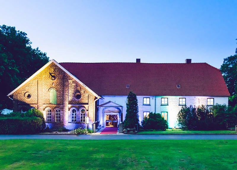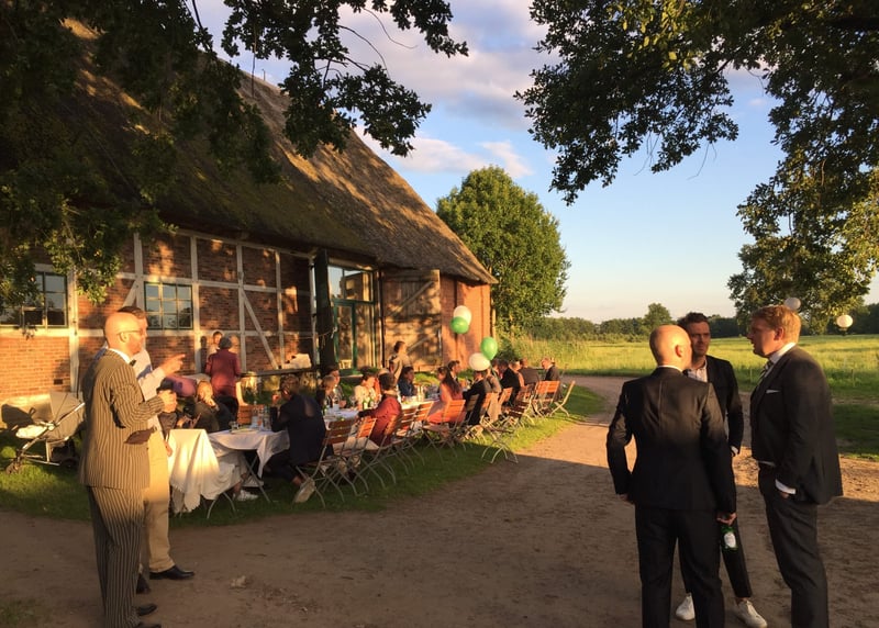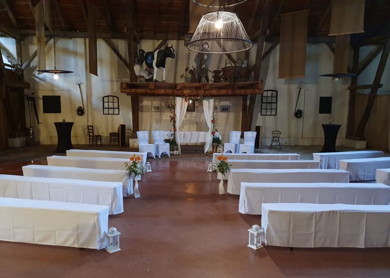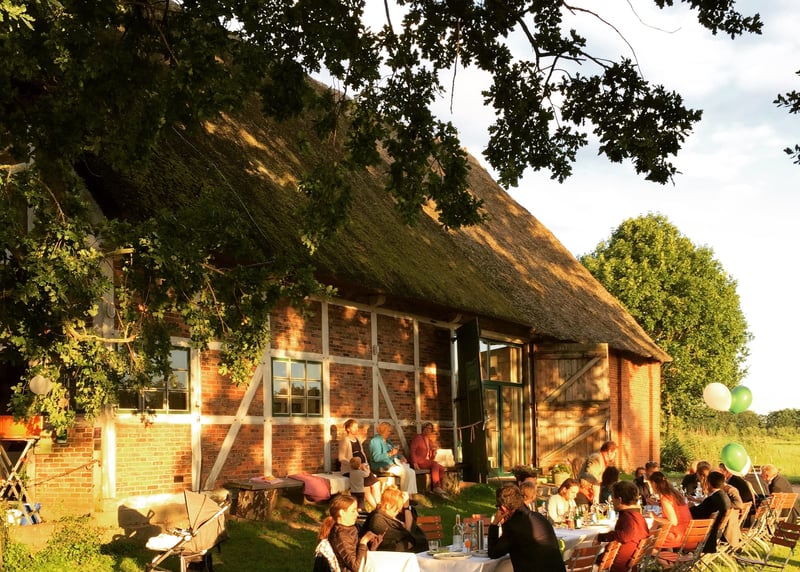 Kuhstall in der Nähe von Hamburg: Der umgebaute Kuhstall verfügt über ein geräumiges Interieur und bietet in gemütlicher Atmosphäre Platz für bis zu 120 Gäste. Auch hier gibt es einen schönen Garten für Zeremonien und Empfänge im Freien.