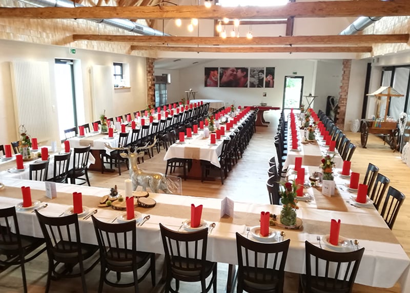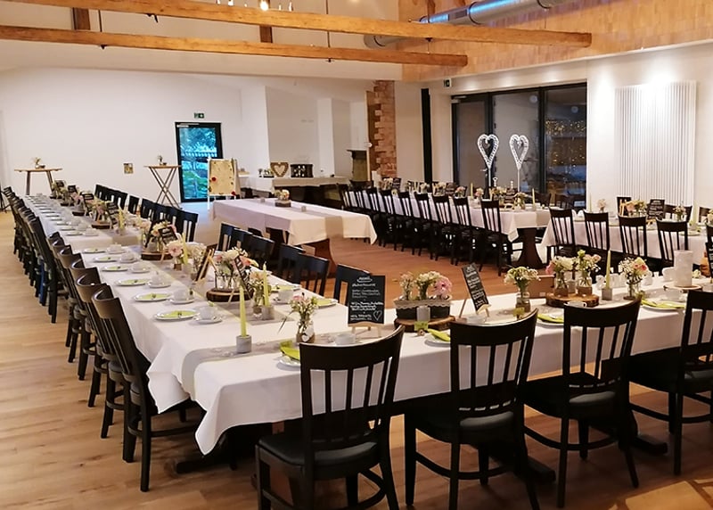 Kuhstall in der Nähe von Hamburg: Der umgebaute Kuhstall verfügt über ein geräumiges Interieur und bietet in gemütlicher Atmosphäre Platz für bis zu 120 Gäste. Auch hier gibt es einen schönen Garten für Zeremonien und Empfänge im Freien.