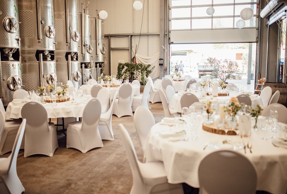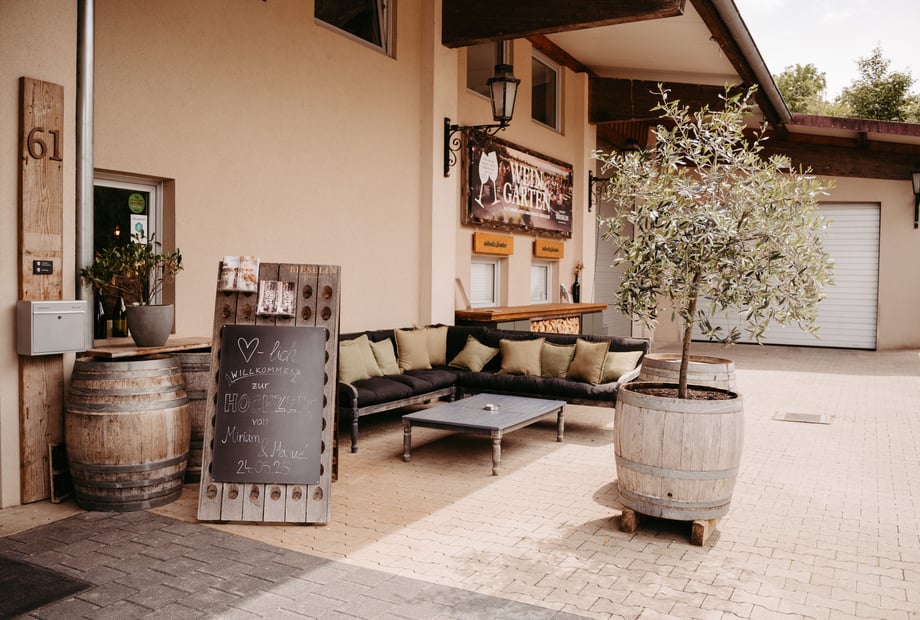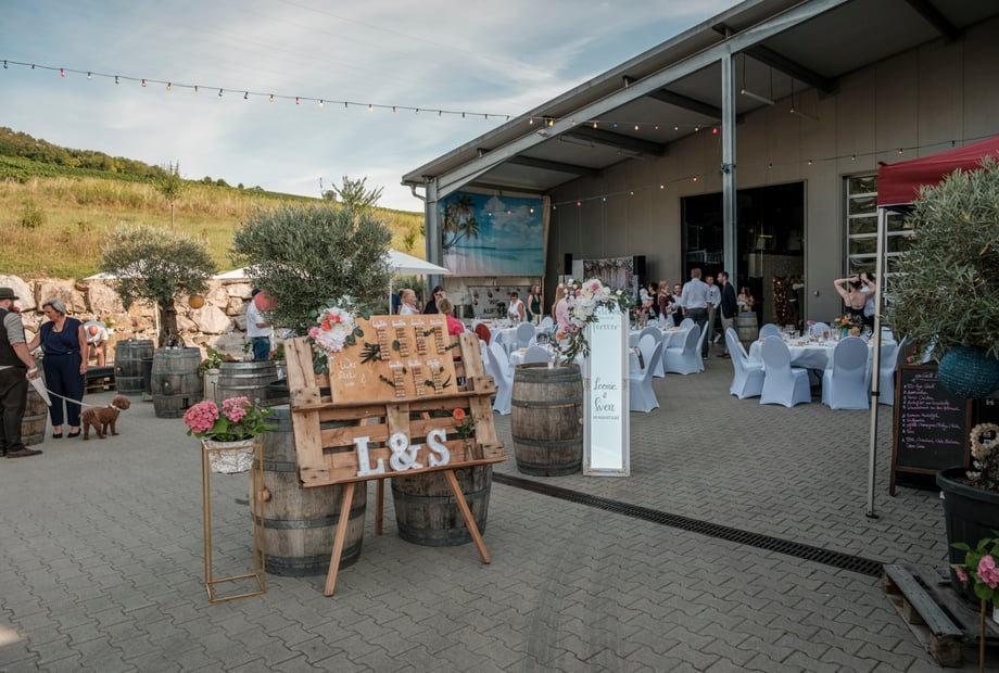 Ja - ich will! Eure Hochzeit in unserem Weingut wird eine Feier am Fuße der Weinberge mit modernen Ambiente. Eine Feier im Weingut neben modernen Weinfässern und Lichterhimmel oder im Innenhof, mit Blick in die Reben.
