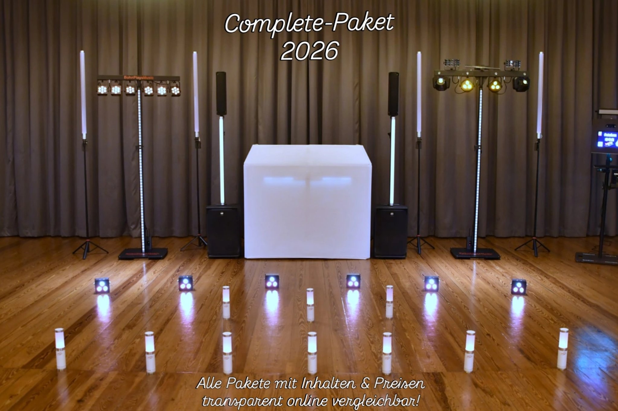 Alle Pakete enthalten eine Pauschale mit einer Dauer von mindestens 7 Stunden ab Musikbeginn. Aufpreise entstehen durch Zusätze wie Anfahrt und Stunden nach der Pauschale. Übrigens: Die Pauschale aller Pakete beginnt nach dem Aufbau, der ca. zwei Stunden vorher (als Teil des Pauschalpreises) startet.