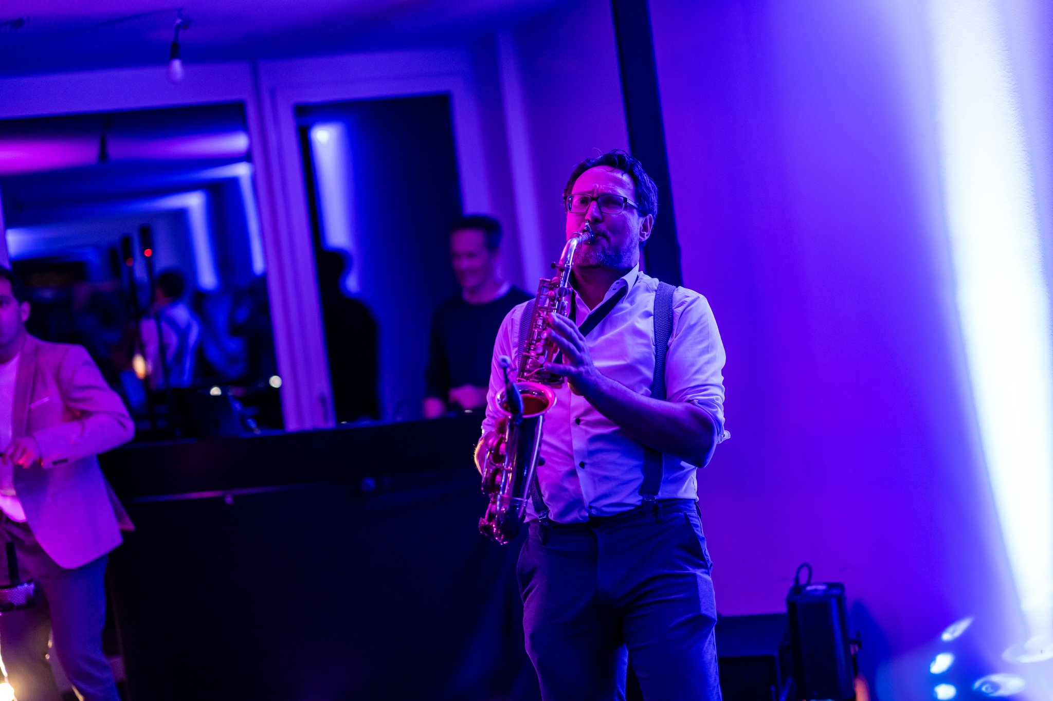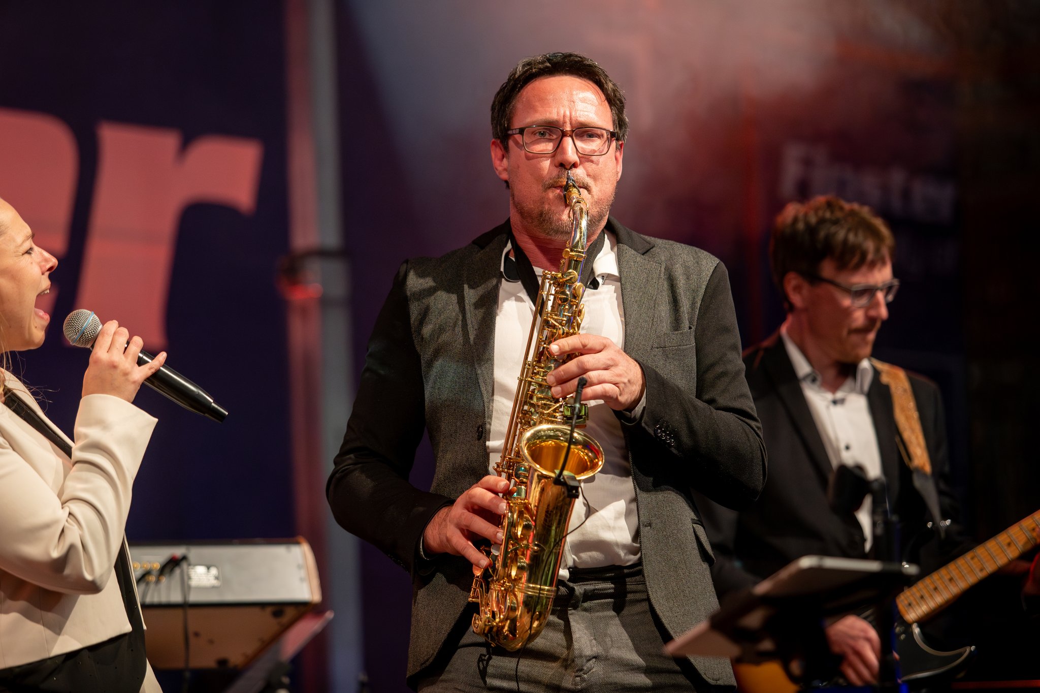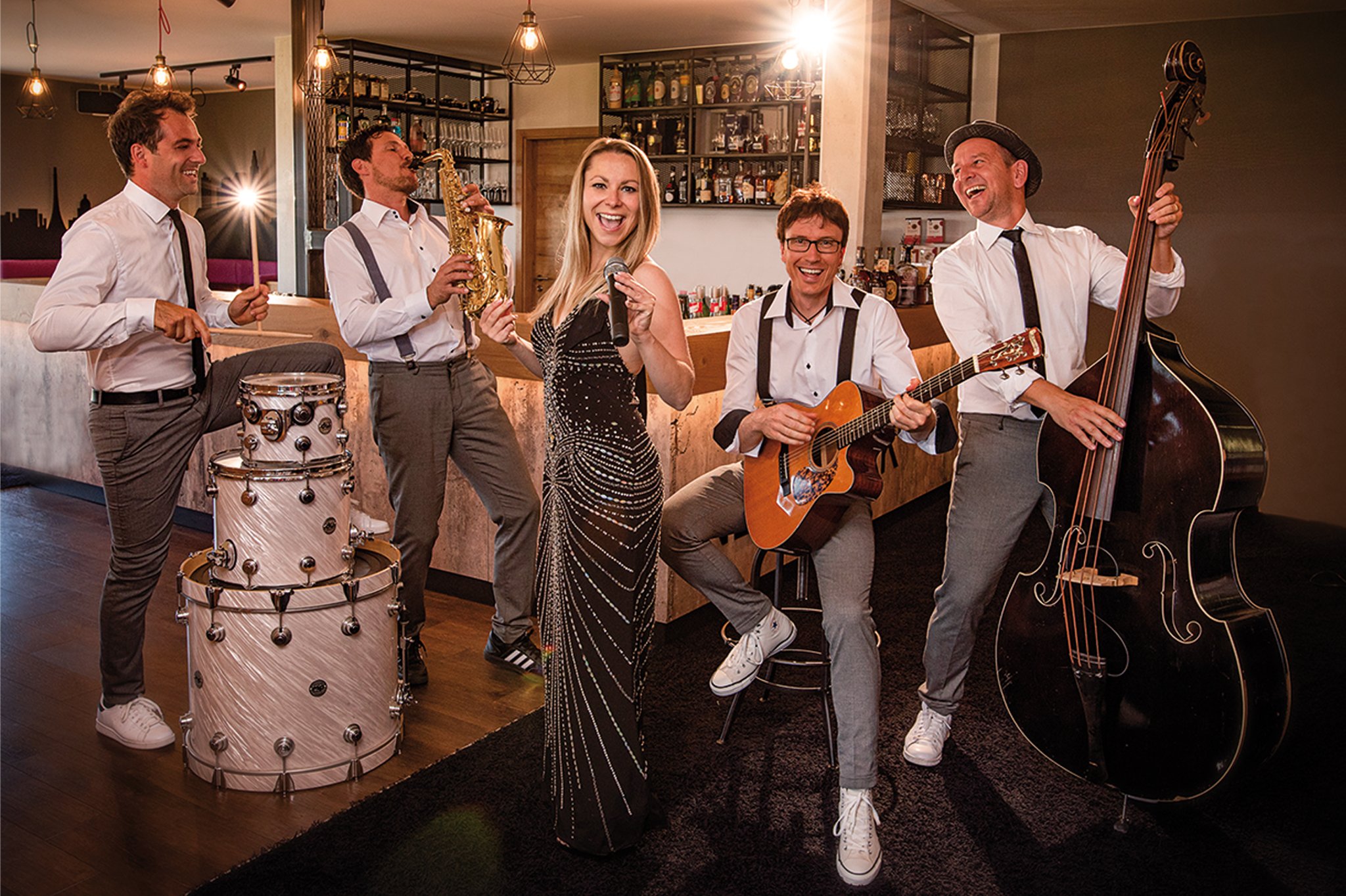 Aber keine Sorge, wir sind flexibel! Wir haben auch schon auf kleineren Bühnen gespielt – allerdings wird es dann kuschelig. Sehr kuschelig. Unser Saxophonist könnte Euch aus Versehen die Frisur neu stylen.