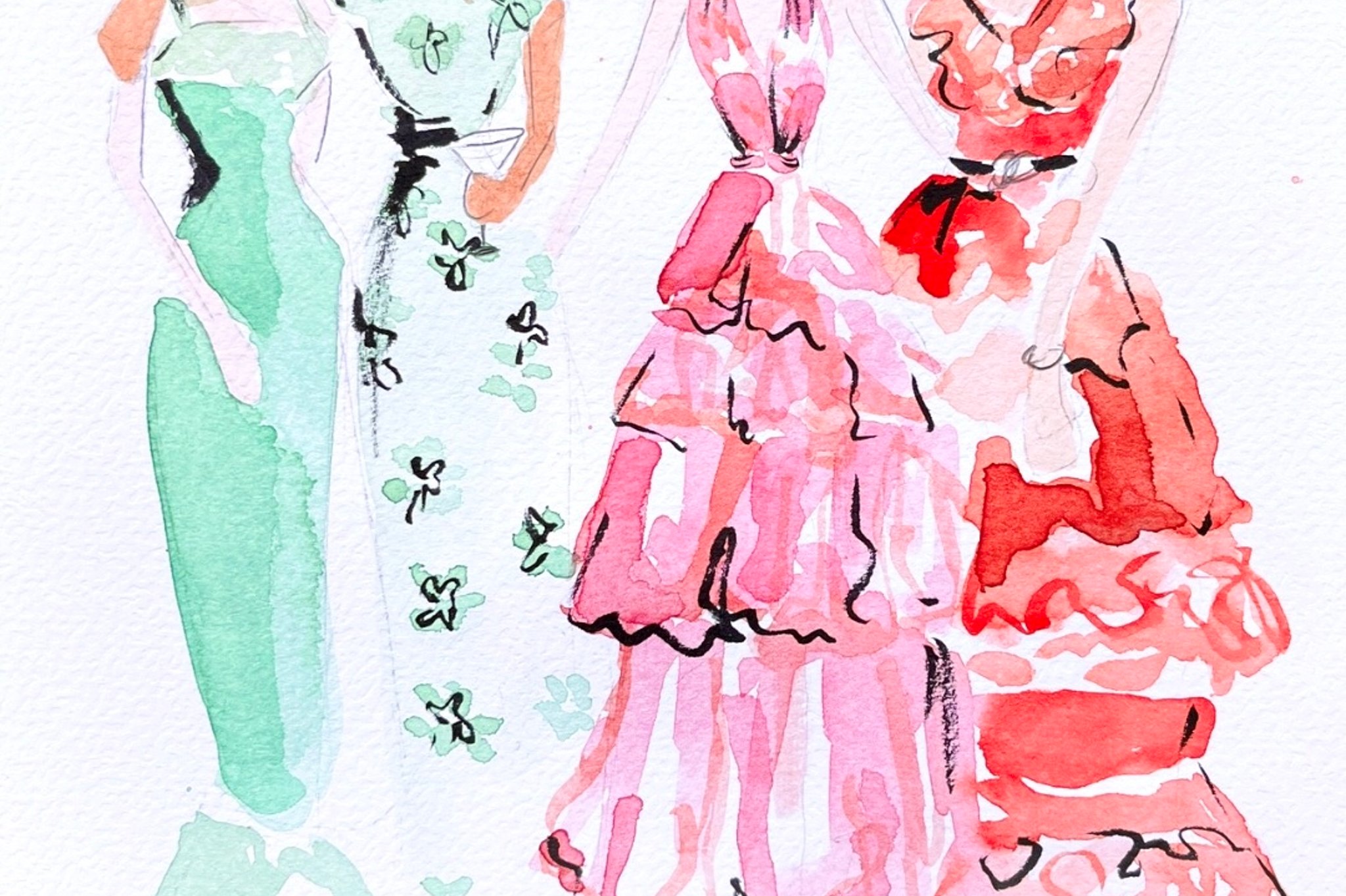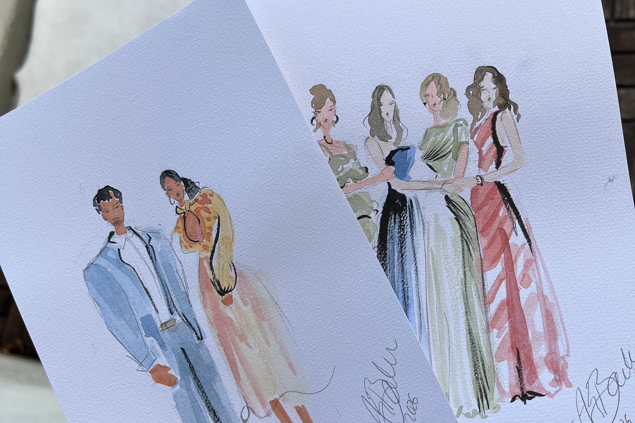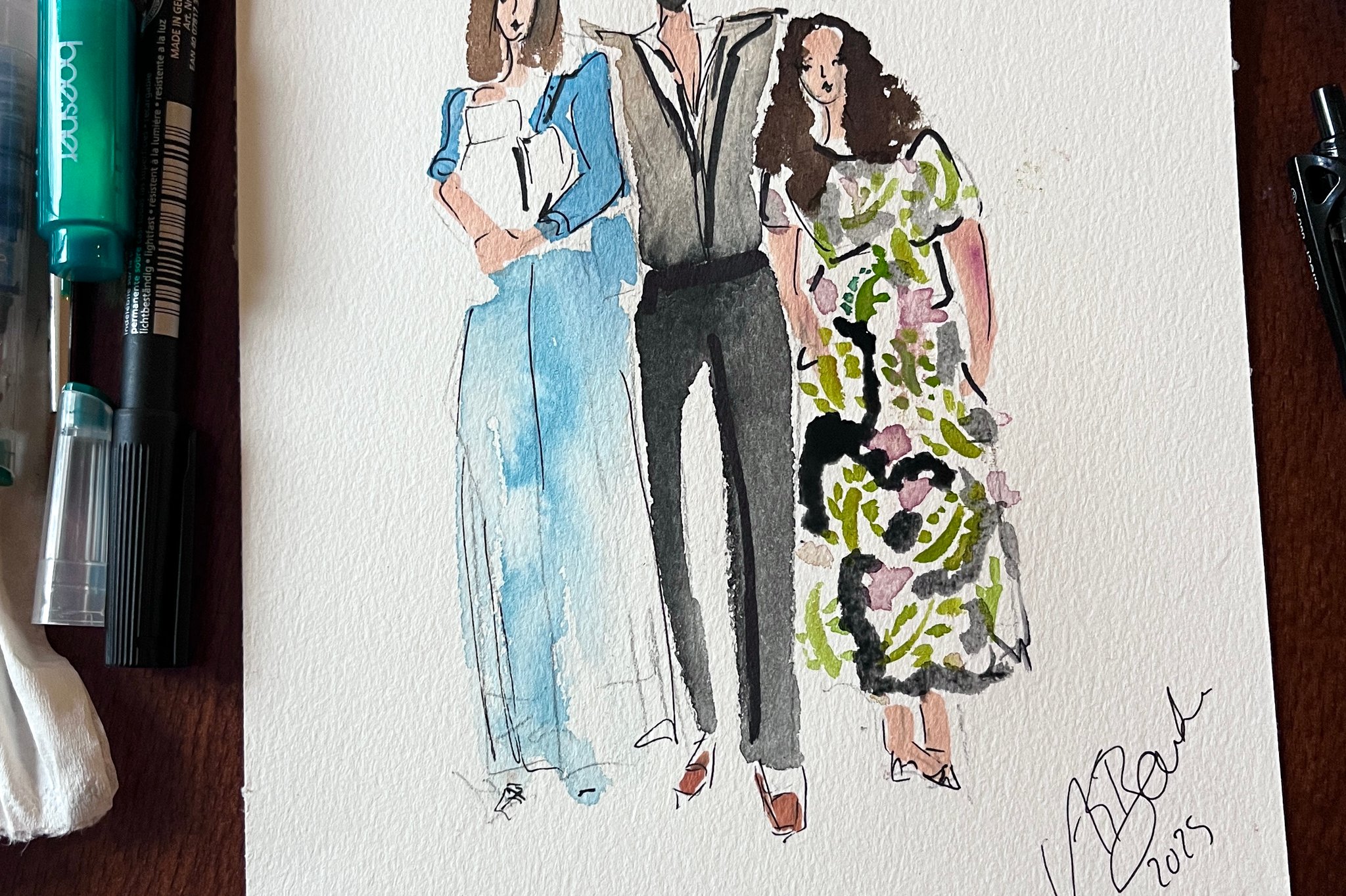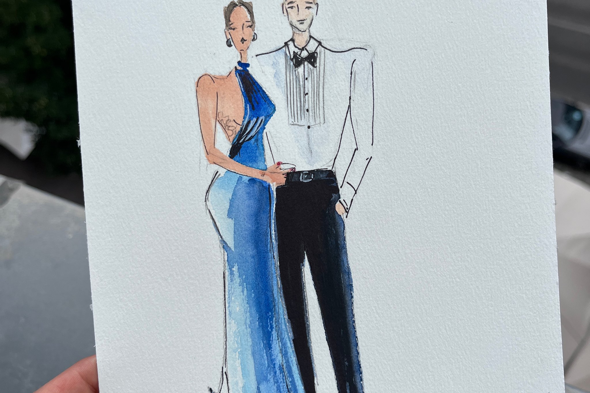 Mein künstlerischer Fokus liegt nicht auf detaillierten Gesichtszügen oder klassischen Porträts, sondern auf der gesamten Erscheinung und dem individuellen Look eurer Gäste. Ich zeichne moderne Ganzkörper-Skizzen, bei denen das Outfit, die Silhouette und die besondere Ausstrahlung im Mittelpunkt stehen. Durch diesen modischen Ansatz fange ich die Eleganz der Abendgarderobe und die feinen Details der Accessoires auf künstlerische Weise ein. Es entstehen stilvolle Fashion-Sketches, die den Vibe des Moments widerspiegeln, ohne dass die Gäste für ein genaues Porträt lange stillstehen müssen.