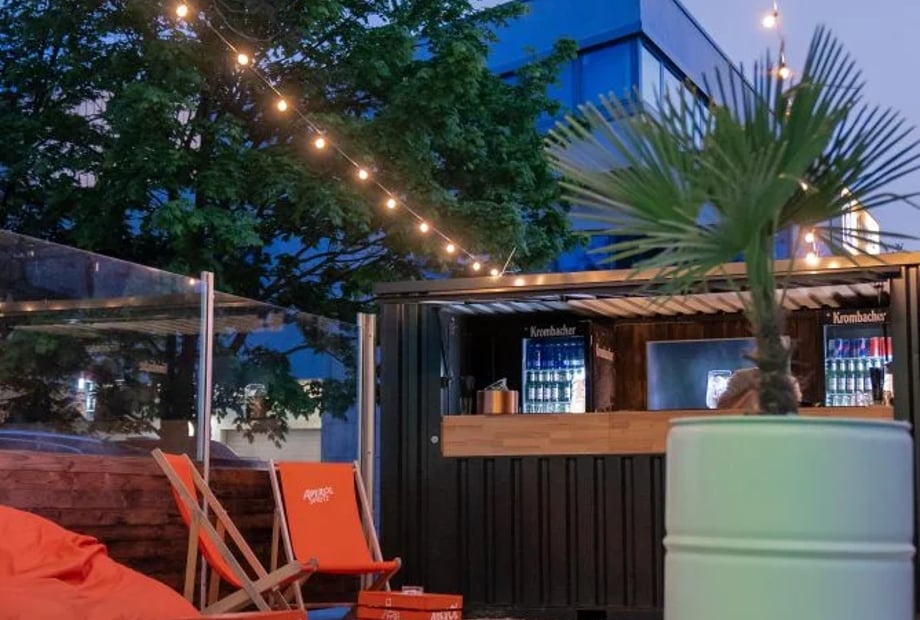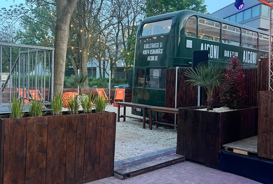 Ein echtes Highlight ist der große Außenbereich mit Terrasse und Beachbereich. An der Außentheke werden erfrischende Drinks serviert, während ein umgebauter englischer Doppeldeckerbus als Foodtruck dient – ideal zum Beispiel für das Mitternachtsbuffet.