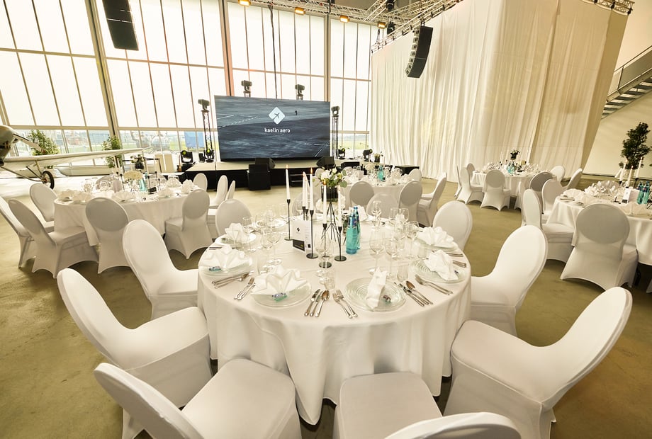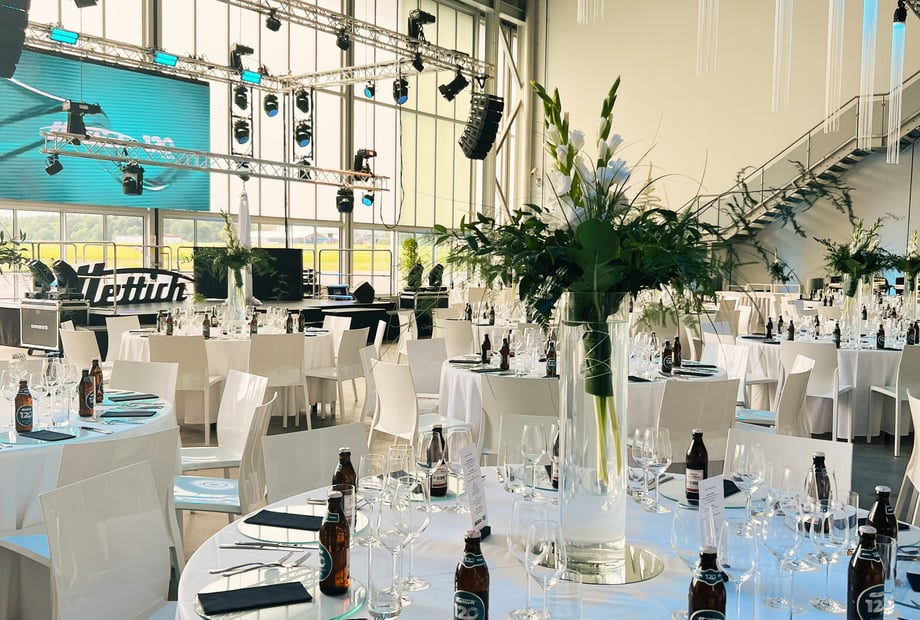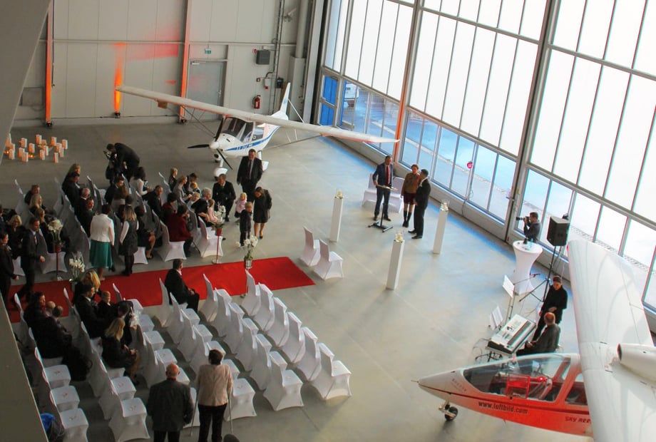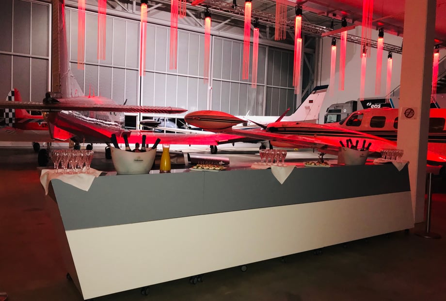 Der Hangar Bravo besticht durch industriellen Charme und viel Platz: bis zu 850 Gäste stehend oder 530 bei Bankettbestuhlung. Perfekt für große Hochzeiten, Tanzfläche und Party.