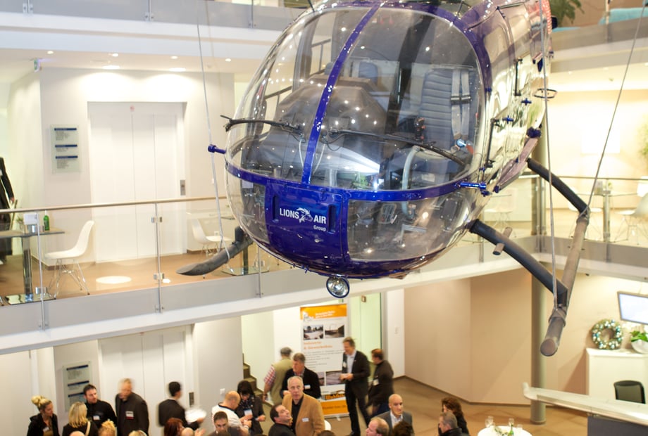 Die Helibase erstreckt sich über drei Etagen und wird von einem echten Helikopter gekrönt, der von der Decke hängt. Ein außergewöhnlicher Raum für Hochzeiten mit Wow-Effekt.