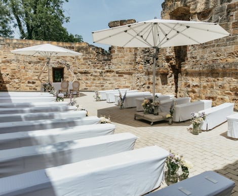 Burgscheune Urig und zugleich exklusiv elegant präsentiert sich die Burgscheune mit Platz für 60 bis 120 Gäste*. Diese Location im Burghof ist der ideale Ort für Hochzeiten und private Empfänge.
