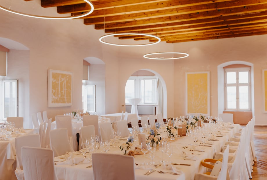 • Intimere Räume wie der Mayersaal, Kaminhalle oder der Sturmfederturm schaffen eine warme, persönliche Atmosphäre für kleinere Gesellschaften.