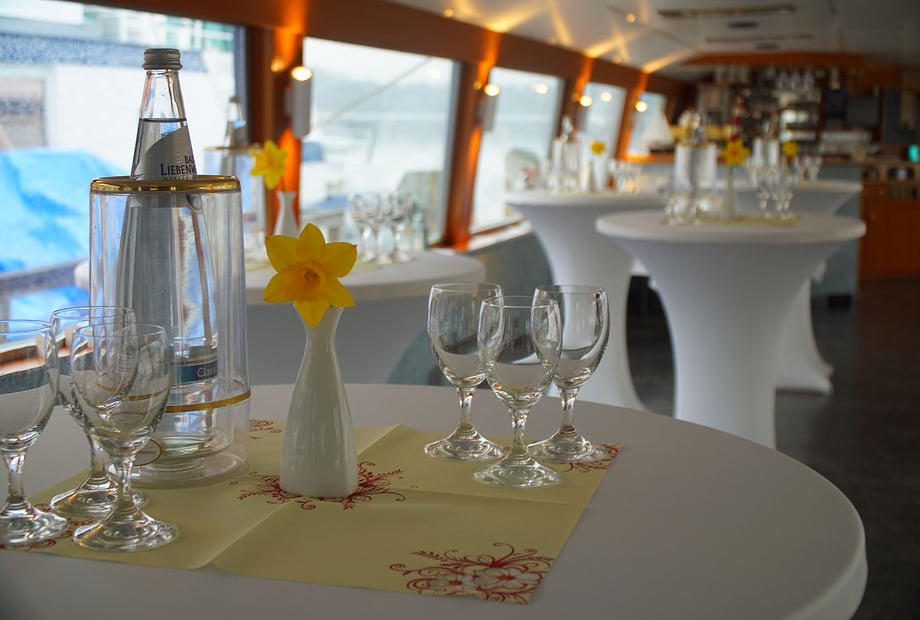 2 Stunden bis 10 Stunden Charter für eines unserer Schiffe. Leerfahrt 200€ pro Stunde / Leerfahrt jede angefangene Stunde 70€ / Änderung der Bestuhlung: 70€ - 150€ / Personenpauschale jede Stunde ab Mitternacht 150€. || Wir gewähren Ihnen von Montag bis Donnerstag in der Zeit vom 05.03.- 27.11.2022, 10 % Rabatt auf den Charterpreis (außer an Feier- und Brücktentagen). Bei Charterfahrten mit Fremdcatering wird von Fr. bis So. eine Zusatzpauschale von 650 Euro und von Mo. - Do. (außer an Feier- und Brückentagen) von 350 Euro erhoben. Buffets: Ab einer Mindestteilnehmerzahl von 30 Personen. Bitte sprechen Sie uns zur Wahl Ihres Buffets an!