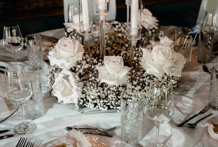 Nach all der Aufregung der Trauung und des Empfangs hatten sie die Gelegenheit, einmal tief durchzuatmen und alles auf sich wirken zu lassen – die liebevolle Dekoration, das sanfte Kerzenlicht, die festlich gedeckten Tische. Es war ein Augenblick purer Emotion, in dem sie sich bewusst wurden: Das ist unser Tag. Das ist unser gemeinsamer Start in ein neues Kapitel.