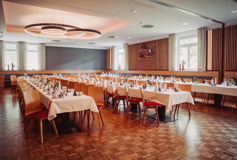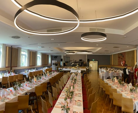 - Großer Festsaal: Der frisch renovierte, teilbare Saal ist ideal für bis zu 180 Gäste. Mit Tanzparkett und moderner Bühne ist er perfekt für Live-Bands oder DJs.