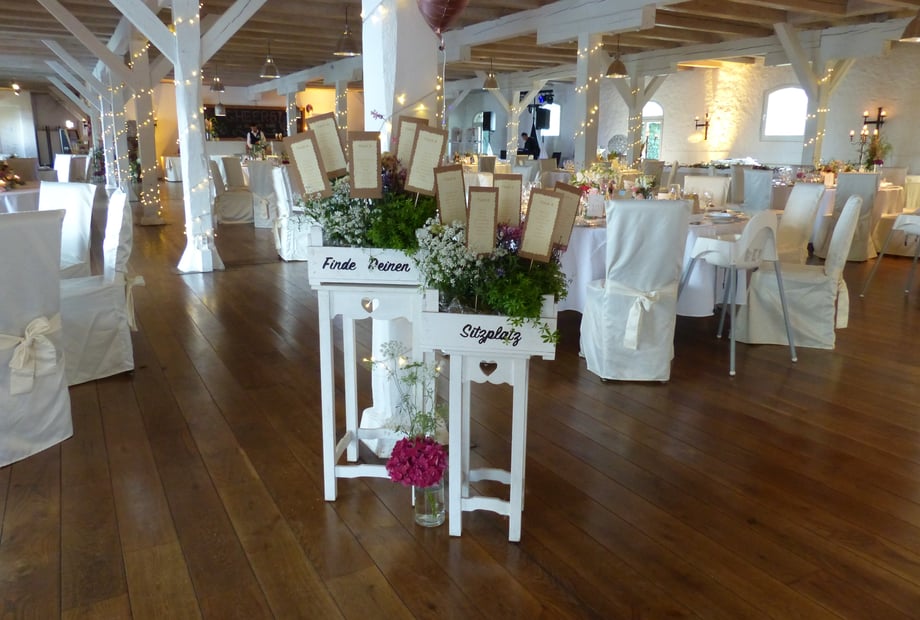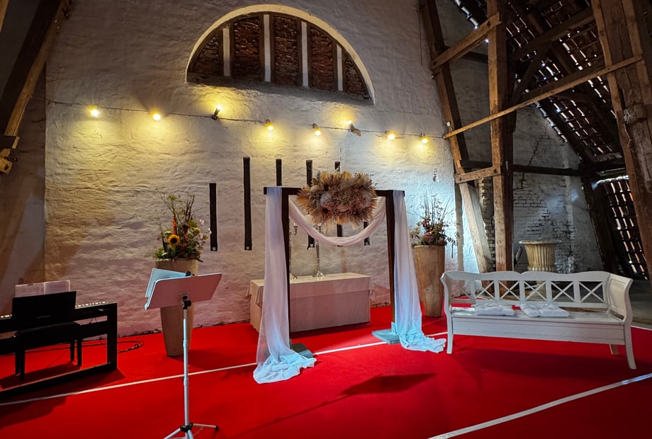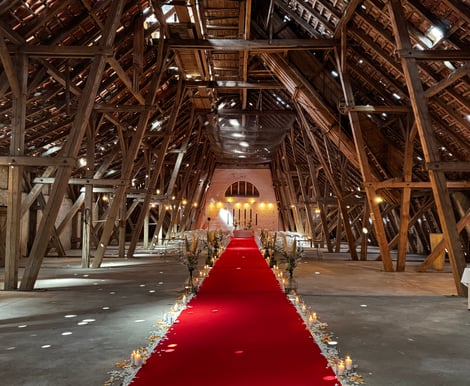 Ein echtes Highlight ist außerdem unser Dachboden: Hier können freie Trauungen stattfinden. Durch die besondere Architektur erinnert der Raum fast an eine große Kapelle.
