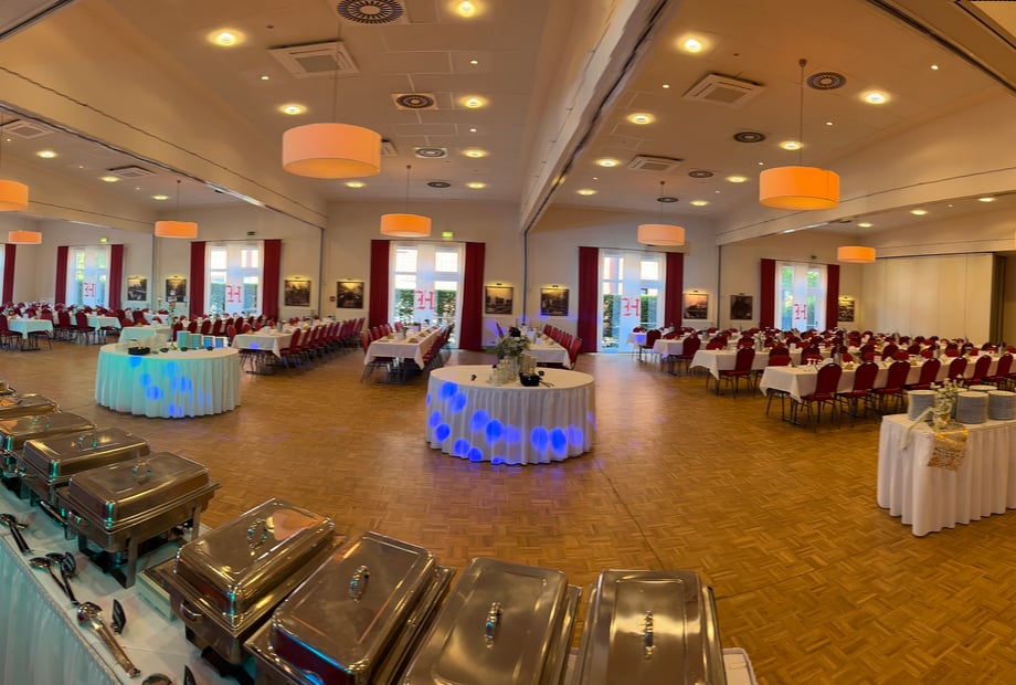 - Flexible Raumaufteilung: Schallisolierte Trennwände ermöglichen es, den Saal in bis zu fünf separate Bereiche zu unterteilen. So finden Sie immer die perfekte Größe für Ihre Gäste.