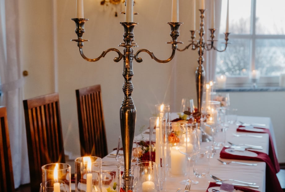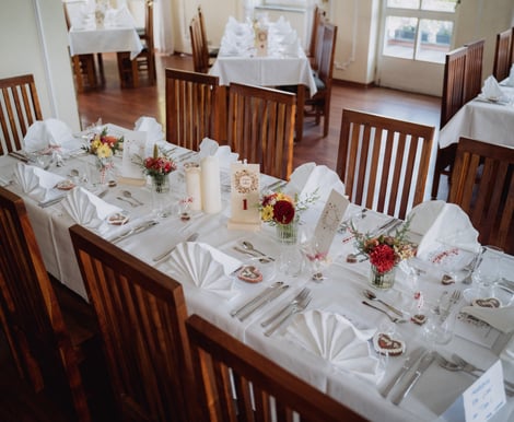 Ja haben wir. Bei uns werden die Tische standardmäßig für Hochzeiten mit weißen Tischdecken und Stoffservietten eingedeckt. Außerdem haben wir bei uns im Haus eine eigene Blumendekorateurin, welche sich gerne mit Ihnen besprechen kann. Der Vorteil daran ist, dass sie die Location wie ihre Westentasche kennt und daher genau weiß, von was Sie wie viel braucht und wie genau es aufgebaut wird. Außerdem fertigt sie auch gerne den Brautstrauß und Anstecker an, sodass alles in einem Stil möglich ist.