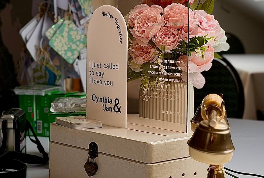 Ein besonderer Touch war eine DIY-Fotoecke mit persönlichen Requisiten und Bildern des Brautpaares – es hat für viel Spaß und unvergessliche Erinnerungen gesorgt.