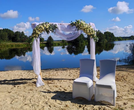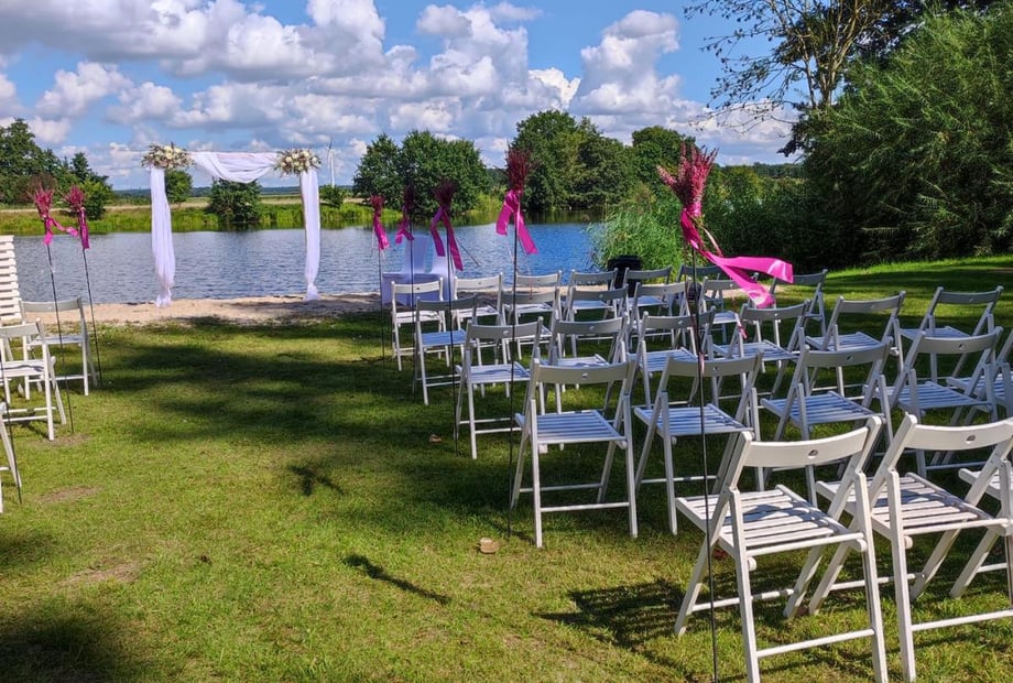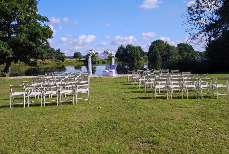 Eine Wiese an einem See über den geblickt werden kann. Weiße Stühle und ein Traubogen. Wie bei uns am Reihersee!