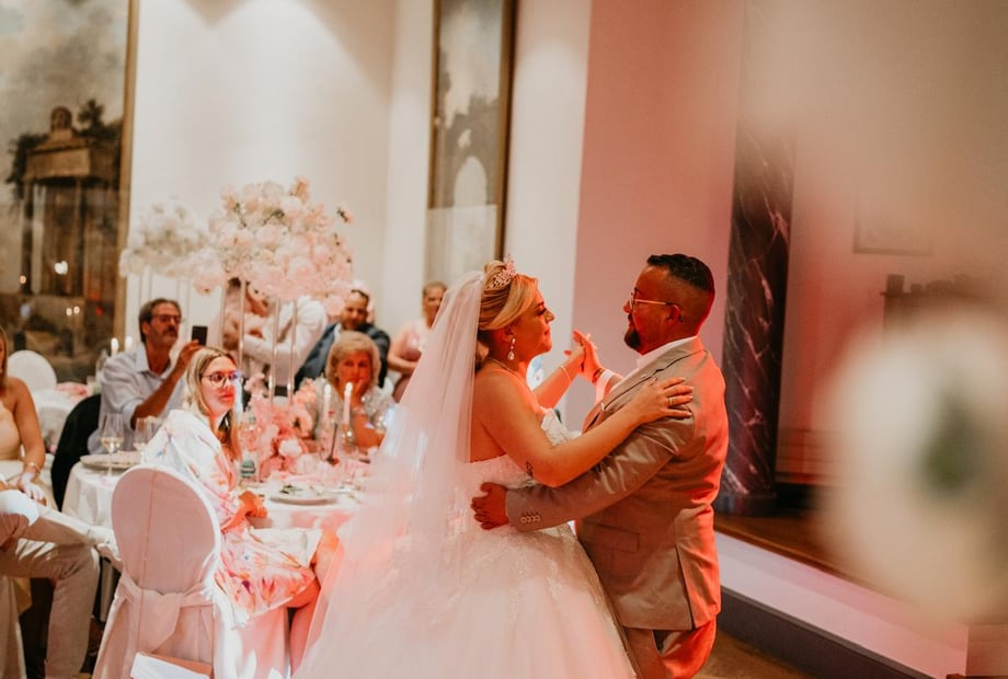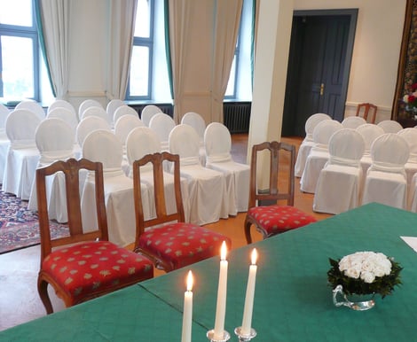 Für elegante Empfänge und festliche Feiern, wie Hochzeiten, Jubiläen oder Geburtstagsfeste, bietet sich der prachtvolle Festsaal an, der mit einem bezaubernden Gartensalon und einer großzügigen Freiterrasse verbunden ist. Nach der Trauung können Sie mit Ihren Gästen auf der Terrasse anstoßen und den atemberaubenden Blick auf den idyllischen Schlosspark genießen.