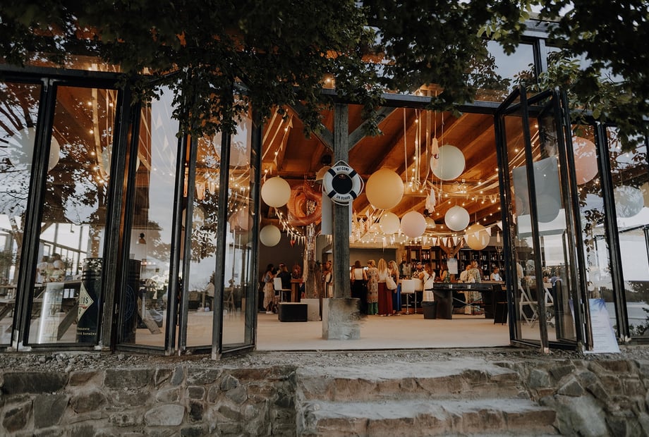 Das Herzstück des Wakebeach 257 ist der über 200 m² große Eventbereich mit einem durchdachten Design. Massives Eichenholz, Estrichbetonböden und natürlich begrünte Raumteiler schaffen eine harmonische Verbindung zur Natur. Die dreiseitige Glasfront sorgt für viel Tageslicht und eröffnet einen traumhaften Blick auf die Seelandschaft. Die Location bietet Platz für bis zu 199 Gäste bei einem gesetzten Essen und bis zu 700 Personen bei einem Empfang – ideal für intime Feiern oder große Hochzeitsgesellschaften.