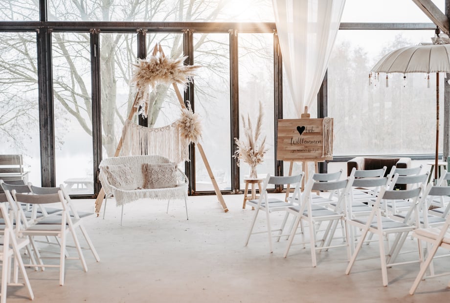 Egal ob Ihr Euch eine sommerliche Trauung barfuß im Sand wünscht, ein farbenfrohes Frühlingsfest plant oder eine gemütliche Winterfeier bevorzugt – das Wakebeach 257 passt sich Euren Vorstellungen perfekt an. Im Sommer bietet der großzügige Außenbereich mit über 900 m² Terrasse, direktem Seezugang und vielfältigen Sitzmöglichkeiten die ideale Kulisse für eine Feier unter freiem Himmel. Stellt Euch eine freie Trauung mit Blick auf das Wasser, einen Sektempfang am Strand oder eine Outdoor-Cocktailbar vor. Im Winter schafft der Kamin im Innenbereich eine warme Atmosphäre, während die durchgehende Glasfront den Blick auf den Sonnenuntergang über dem See freigibt.