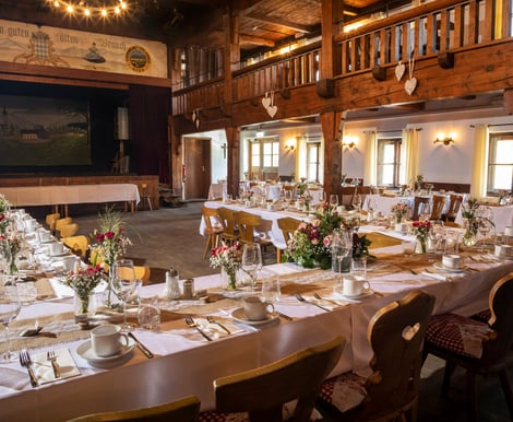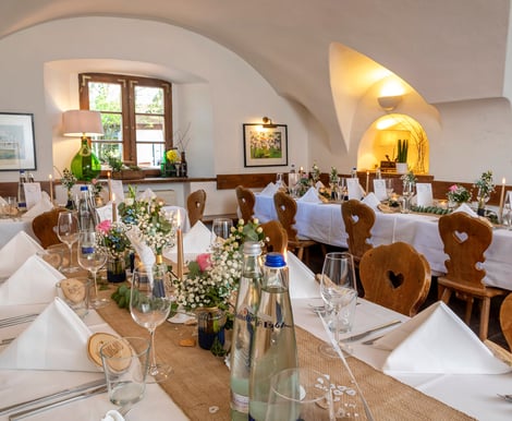 Der großzügige Festsaal ist das Herzstück für Ihre Feier: Mit hohen Decken, warmen Holzelementen und Platz für bis zu 200 Gäste schafft er eine einladende Atmosphäre. Die fest installierte Bühne eignet sich perfekt für Live-Bands oder DJs. Eine gemütliche Galerie oberhalb bietet zusätzlichen Raum, der flexibel genutzt werden kann. Für kleinere, intime Feiern stehen charmante Stuben wie das „Stüberl“ oder das „Gewölbe“ zur Verfügung. Und wenn das Wetter mitspielt, lädt der traditionelle Biergarten unter alten Kastanienbäumen zum Empfang oder entspannten Beisammensein im Freien ein.
