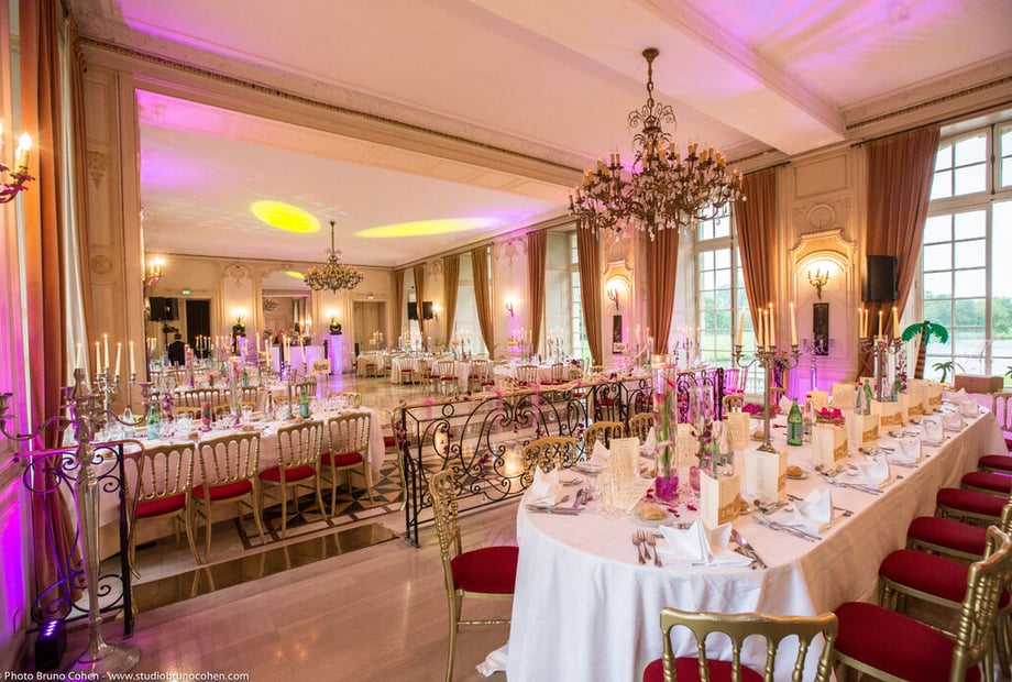 The main reception room, "Radziwill," spans 210 square meters and seats 174. The adjacent, more intimate "Girardin" room (seats 48) and other lounges allow you to host your guests in a historic setting. The terrace, with its breathtaking views of the 17-hectare park and overlooking the river, or the main courtyard, provide the perfect backdrop for your cocktail reception.