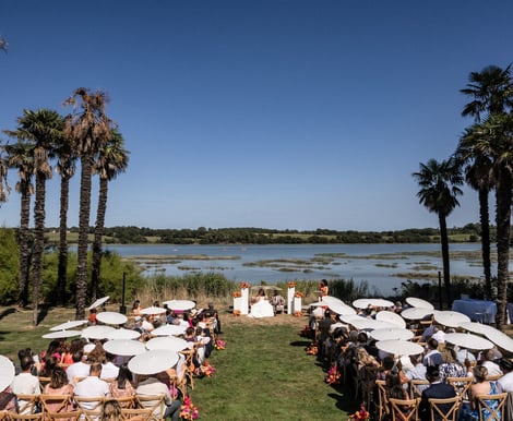 For your special moments, the estate offers numerous outdoor spaces: an exotic palm grove, a heated swimming pool, and the lawn surrounding the pool with its pergolas, ideal settings for cocktails and secular ceremonies. Finally, a 100 m² barn located near the lodge village completes this setting, offering you a flexible solution for every highlight of your reception.