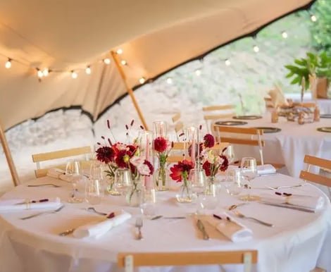 For up to 20 people staying at the hamlet, the price is €3,900 for two nights, including breakfast and use of the semi-professional kitchen for preparing your lunches and/or dinners, either by you or a caterer. For each additional person, the price is €70 per night for two nights, including breakfast. For 40 people, the price is €5,300 (accommodation, breakfast, and use of the semi-professional kitchen for you and/or caterers). Tourist tax: €0.77 per adult per night. The hamlet can accommodate up to 40 people in the common room, which also has a large adjoining terrace. For larger groups, a "Nomad" tent with a wooden floor is also available, including the tent, tables, chairs, and catering area (80 seated guests or 100 for a cocktail reception). This option costs €4,500.