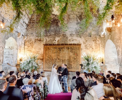 Whether you would like a religious, humanist or civil ceremony, there are a number of beautifully romantic locations at Dundas Castle where you can exchange your vows. The Great Hall within the medieval Auld Keep is the most popular location for ceremonies; the Hall with its vaulted ceiling and ancient stonework add to the atmosphere of romance. The elegant Croquet Room provides an altogether different ambience for a wedding ceremony; the impressive open fire, crystal chandelier and outlook across the sweeping lawns of the Estate make this room popular for a more intimate wedding. Outdoor wedding ceremonies are becoming increasingly popular, and with a choice of settings, there is no reason why you can’t say ‘I do’ in a beautifully serene garden location on the Dundas Estate, or in the charming Courtyard. Once the formality of the ceremony is over and the celebrations commence, whether you want an intimate candlelit feast for close family and friends in Stag Chamber, a more formal wedding breakfast in the elegant Croquet Room or a larger dining celebration with dancing into the night for up to 200 people in the Pavilion, Dundas provides options to suit all. The front of the Castle is the perfect backdrop for a grand finale, with a marching Scottish pipe band and fireworks lighting up the night sky. Our expert team will guide you through the planning of your wedding, and make recommendations based on their experience, as to which suppliers would work best with you to make your dream wedding a reality. During your wedding, our skilled team will be discretely by your side throughout the day to ensure that each and every moment is enjoyable, seamless and to plan. Many couples take full advantage of Dundas Castle being a destination for their wedding; with 17 delightful bedrooms, a wedding is an ideal opportunity to extend the celebration for 2, 3 or more nights. However long you decide to celebrate with friends and family, your memories will be treasured always.