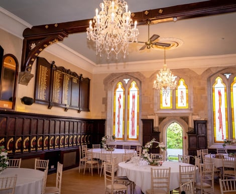 Wood-panelled walls, stunning chandeliers, and breath-taking stained glass windows