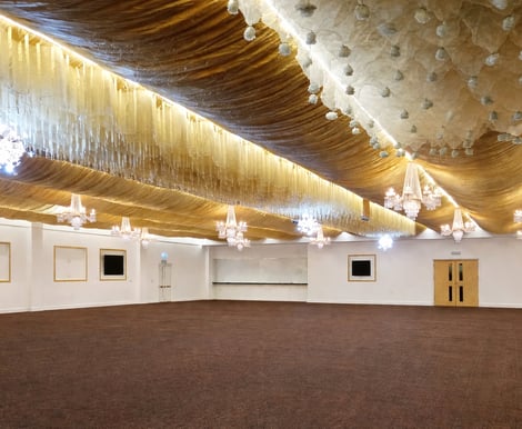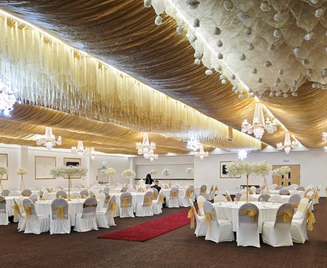 The venue features a stunning marquee-style interior, enhanced by luxurious golden ceiling drapes and sparkling hanging chandeliers, creating a warm and romantic atmosphere that can be tailored to suit any wedding theme. From classic and traditional to modern and glamorous, our venue provides a blank canvas to bring your vision to life.