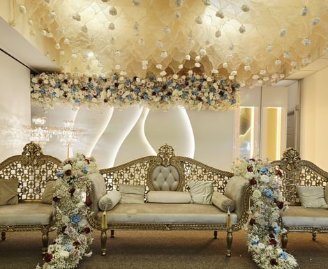 Our venue can host weddings from 100 up to 750 guests. For smaller celebrations, we offer a partitioned setup, so the hall can be divided to create a more intimate space for up to 300 guests while maintaining the same elegant atmosphere.