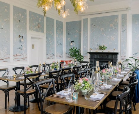 Our venue boasts a charming Georgian townhouse setting, including the Admiral room's romantic décor with hand-painted wallpaper, a fireplace, and a stunning glass chandelier, combined with the beautiful secret walled garden and intimate atmosphere – perfect for couples looking for an elegant and memorable wedding location.