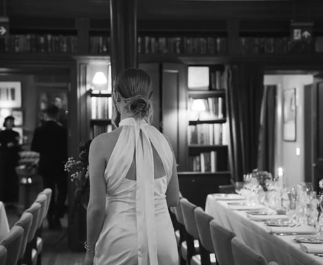 Guests often begin with champagne and conversation in the Club Bar before moving through to The Library for a candlelit wedding breakfast, where long tables fill the room and the celebration gathers pace.