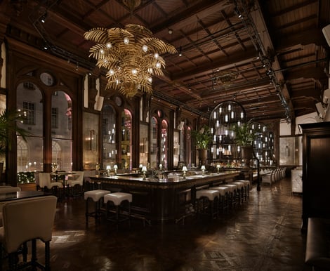 Guests can enjoy a timeless atmosphere featuring Victorian craftsmanship such as sleek wooden floors, intricate iron bannisters, and round-arched windows, complemented by modern touches like elegant chandeliers, gold-coated walls, and fresh floral arrangements creating an inviting and enchanting environment.